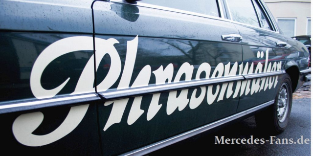 Zugegeben, der Song zählt nicht zum Repertoire, aber der Daimler passte nach Ansicht von Band und Management dennoch perfekt. Schließlich war er nicht der neueste und teuerste Vertreter der S-Klasse, sondern ein angejahrter aber gut gepflegter Youngtimer. Und um ihm den Charme eines echten Bandmobils zugeben bekam er nicht etwa eine Polizeilackierung, sondern schlicht, ergreifend und werbewirksam den Phrasenmäherschriftzug auf die Flanke verpasst. Und so ist er ja schließlich auch dem Schreiber dieser Zeilen aufgefallen.
