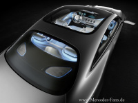 Die seitliche Silhouette wird von der kuppelförmig gespannten Dachlinie und den rahmenlosen Türen definiert. Ein eleganter, dreidimensionaler Chromrahmen fasst die Glasflächen ein, die von keiner B-Säule unterbrochen werden. Das unterstreicht die Mercedes-typische Coupé-Optik. Bei der Gestaltung der geständerten Außenspiegel nutzen die Designer die Freiheiten eines Concept Cars und formten diese besonders schlank und lang, wodurch sie elegant erscheinen. Elegant aber auch muskulös wirken aber Schulterpartie und Heck, wo der Stern sehr prominent auf dem glattflächigen Heckdeckel platziert ist.