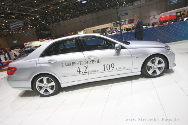 Nach der Weltpremiere vor zwei Monaten in Detroit gibt der Mercedes-Benz E 300 Blue Tec Hybrid in Genf auf dem Autosalon sein Europadebüt, Mit einem Normdurchschnittsverbrauch von 4,2 Litern auf 100 Kilometer ist der 204 PS starke und auch als Kombi erhältliche Wagen laut Daimler die sparsamste Oberklasse-Limousine der Welt.