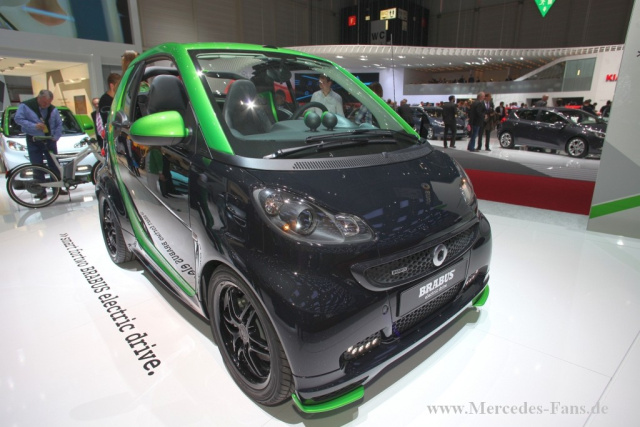 Brabus zeigt den getunten Smart Fortwo Electric Drive, der Ende des Jahres auf den Markt kommen soll. Der Elektromotor bietet eine Leistung von 60 kW / 82 PS und entwickelt 135 Newtonmeter Drehmoment.