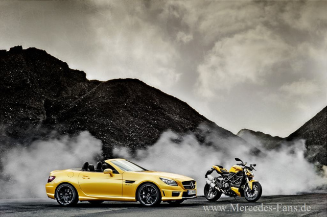 Gelb gefällt einfach zweifach: Wenn am 3. Dezember die Bologna Motor Show ihre Tore öffnet, dann haben Mercedes AMG und der Motorrahersteller Ducati zwei heiße Eisen im Streetfighrter-Yellow"-Partnerlook im Rennen um die Publikumsgunst im Feuer. Ist nun der 422 PS starke Mercedes SLK 55 AMG eine Ducati-Sonder-Editon oder ist die 132 PS starke Ducati 848 Streetfighter so etwas wie ein Mercedes AMG Sondermodell? Wie man es auch dreht und wendet: das doppelte Flottchen ist ein augenscheinliches Indiz dafür, dass sich die Zusammenarbeit zwischen Mercedes AMG und Ducati, die auf der L.A. Autoshow 2011 mit einem Paukenschlag angekündigt worden war, verfestigt und intensiviert.