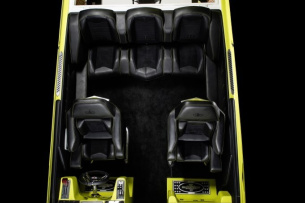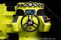 Design und Ausstattung spiegeln die hohe Dynamik des Concept Cigarette AMG Electric Drive wider. Die für Cigarette Racing typischen Sportsitze werden von zahlreichen Carbon-Elementen im Cockpit flankiert. Hinter dem Lenkrad entdeckt man das gleiche Anzeigekonzept wie im SLS AMG Coupé Electric Drive: Ausgestattet mit Ziffernblättern in AMG Electricbeam magno und AMG Logos, informieren die Anzeigen über die momentane Motorleistung, die Geschwindigkeit sowie über die Spannung und den Ladezustand der Batterie.