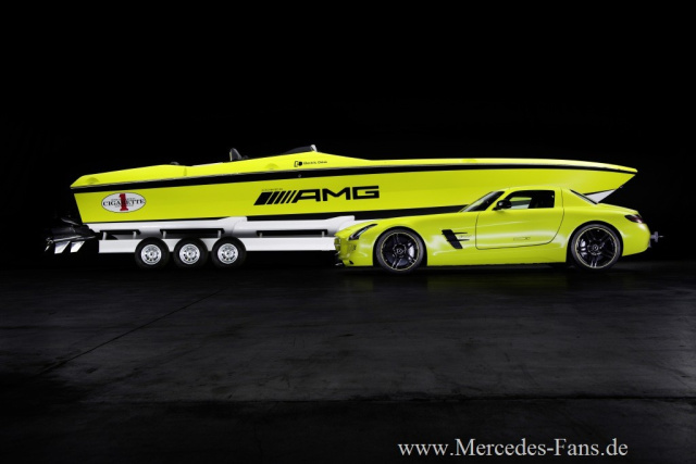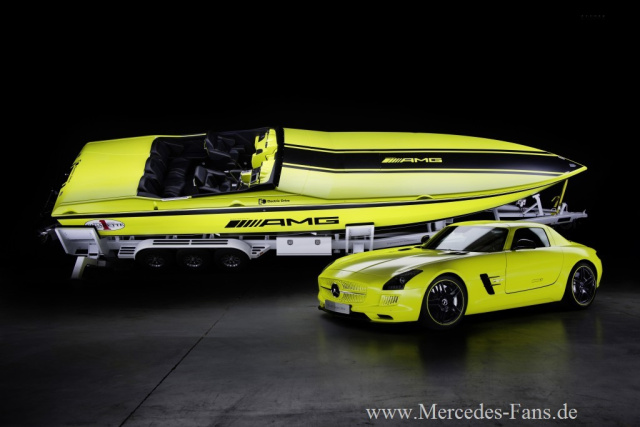 AMG Electricbeam magno der exklusiv für den SLS AMG Coupé Electric Drive lieferbare Mattlack findet sich auch auf dem 38 (11,6 Meter) langen Powerboat Concept Cigarette AMG Electric Drive wieder. Zusammen mit den seitlich angebrachten AMG Logos dokumentiert dies die Kooperation des Bootsherstellers aus Miami mit der Mercedes-AMG GmbH aus Affalterbach. Die Designmerkmale sind zugleich der sichtbare Beweis für den Techniktransfer vom Flügeltürer zum Powerboat. So verwendet Mercedes-AMG zwei Antriebseinheiten mit je sechs Elektromotoren, die unabhängig voneinander mit je einem Getriebe links und rechts im Bootsheck angebracht sind. Ein Blick auf die Motordaten beweist die zwölf kompakten, flüssigkeitsgekühlten Permanentmagnet-Synchron-Elektromotoren stammen aus dem SLS AMG Coupé Electric Drive.