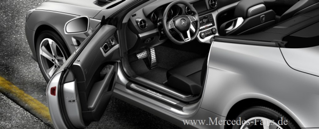 Höchste qualitative Ansprüche erfüllen ebenso die elegante Einstiegsschiene aus gebürstetem Edelstahl mit beleuchtetem Schriftzug oder der Schlüssel-anhänger, dessen SL-Schriftzug der Typographie am Heckdeckel des Fahrzeugs nachempfunden wurde.