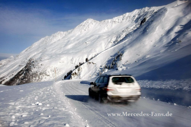 Dass es auch so etwas wie Winterfahrfreuden gibt, durfte ich bei einem Mercedes E-Klasse 4MATIC-Workshop erfahren. Treffpunkt Hochgurgl oberhalb des Ötztals. Dort, 2000 Meter über Null, ist Schnee keine Glücksache, sondern im Winter Alltag. Am Flughafen in Innsbruck steht eine R-Klasse bereit, ebenfalls mit 4MATIC. Wer allerdings nicht auf die Modellschriftzug auf der Heckklappe schaut, der merkt davon nichts. Der komfortable Großraum-Van lässt sich seinen permanenten Allradantrieb nicht anmerken. Gut, die Straßen sind trocken und trotz des einsetzenden Schneefalls erreicht der Chronist Hochgurgel, ohne dass es eines Allrad-Einsatzes bedurft hätte. Übrigens: Mercedes präsentierte erstmas 1985 ein 4MATIC Modell - damals in der W124 E-Klasse .