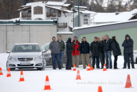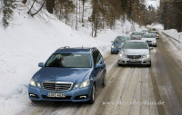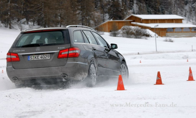 Obwohl der Untergrund spiegelglatt ist, absolviert die E-Klasse das Manöver ohne Probleme. Das Auto beschleunigt sicher und auch die Richtungsstabilität ist perfekt. Komforteinbußen? Nein, keine! Weder beim Abrollen, noch bei der Geräuschentwicklung! Natürlich ist im Hintergrund nicht nur das Allradsystem aktiv, sondern hier arbeitet ein Verbund an elektronischen Regelsystemen wie ESP, 4ETS und ASR. Im Grunde muss der Fahrer nur lenken und Gas geben. Etwas anders schaut die Angelegenheit aus, wenn der ESP-Knopf gedrückt wird. Dann sind schon dynamische Gegenlenk-Manöver gefragt, aber das ESP ist nicht komplett deaktiviert, bevor es zum unkontrollierten Ausbruch kommt, greifen die elektronischen Helferlein ein.