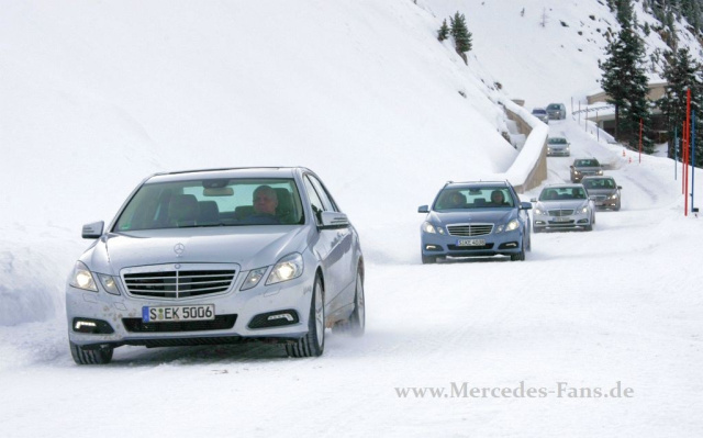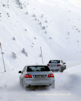 Die Fahrt auf der Pass-Straße gestaltet sich dann trotz Schneemassen entspannt. Richtungsstabilität und Traktion stellen den Fahrer auf der tief verschneiten Strecke vor keine Probleme. Seit Mercedes-Benz die 4MATIC zum ersten Mal 1987 in der W124 E-Klasse anbietet, haben die Techniker viel Feinarbeit geleistet. Das System schlägt mit maximal 50-70 kg Mehrgewicht zu Buche, der Spritverbrauch erhöht sich gegenüber einer heckgetriebenen Mercedes E-Klasse je nach Modell moderat um 0,2 0,6 Liter. Schön ist vor allem, dass die Beule im Beifahrerfußraum weggezaubert wurde. Mit dem e 500 bietet mercedes 5 E-Klasse Modelle als 4MATIC an. Der Aufpreis für sorgenfreien Vortrieb liegt bei E 350 CDI und E 350 zwischen 2 700 und 2 800 Euro. Der Einstieg in eine weitgehend schlupfreihe Zukunft mit der Mercedes E-Klasse beginnt dann bei beiden Modellen mit 53 729 Euro.