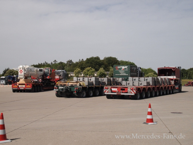 Schon die statische Vorstellung des SLT bei der Weltpremiere im LKW-Werk Wörth Anfang des Jahres war äußerst beeindruckend. So war ich sehr gespannt auf den Driving Event mit dem SLT, der auf dem ehemaligen Truppenübungsplatz bei Münsingen auf der Schwäbischen Alb stattfand. Dort standen vor dem alten Lager zwei SLT auf Basis des Actros und Arocs mit Schwerlast-Kränen auf den Aufliegern zur Testfahrt bereit sowie zwei Test-Züge, die Auflieger vollgepackt mit Lastgewichten und mit einer eindrucksvollen Gesamtlänge von 21 Metern. Am Kopf der beiden 10-achsigen Auflieger wartete jeweils ein Actros 4163 LS 8x4 SLT, bestückt mit der stärksten Variante der neuen BlueTec-6-Maschine, satte 170 t Gesamtzugmasse in Bewegung zu setzen.