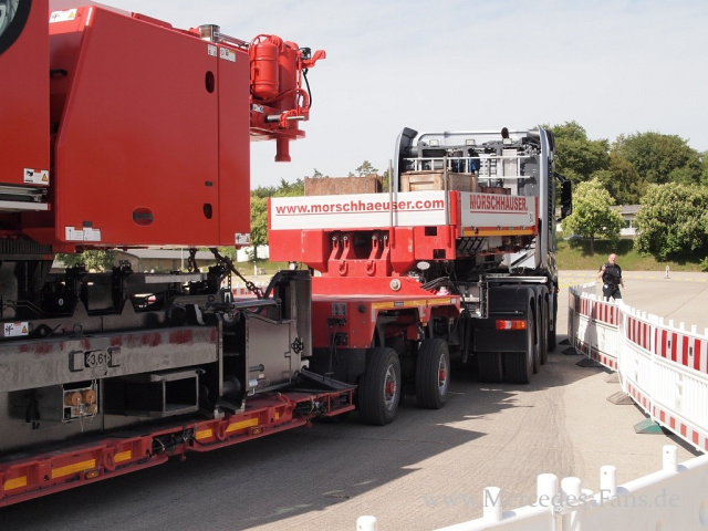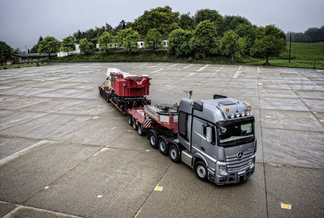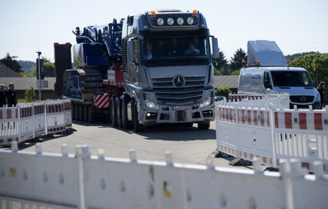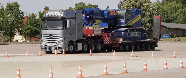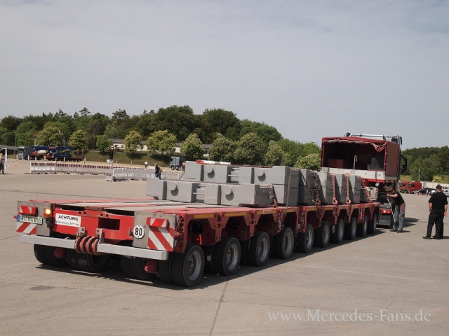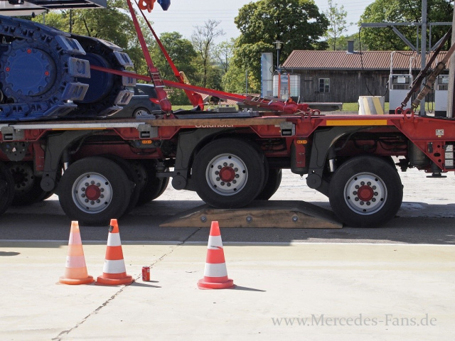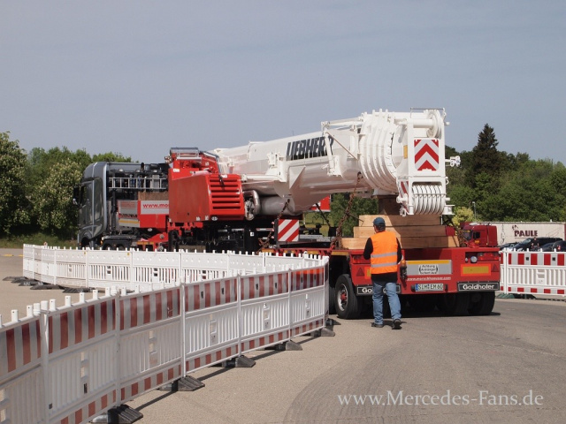 Mit solch einem 170-t-Brocken sollte es später auf die alte Panzerringstraße gehen, eine Teststrecke, die genug Widrigkeiten parat hat, einem Schwerlast-Transporter Höchstleistungen abzuverlangen und den Fahrer unter Umständen ins Schwitzen zu bringen. Ich war sehr gespannt, wie sich der SLT hier schlagen würde, doch für unsere Journalistengruppe standen zuerst ein paar Runden auf dem vorbereiteten Handling-Parcours an, optimal, um erst einmal ein Gefühl für den SLT und dessen Dimensionen zu bekommen, in diesem Fall ein Arocs 4163 8x4 SLT mit einem Schwerlastkran von Liebherr auf einem großen, 6-achsigen Tiefbett-Auflieger.