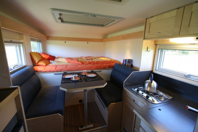 Um die Geländeeigenschaften des Unimog nicht einzuschränken, ist die Wohnkabine von Bocklet im Heck angeschrägt. Sie bietet innen eine Länge von 435 und eine Breite von 220 cm (Stehhöhe 195 cm). Der Drei-Punkt-gelagerte, kältebrückenfreie GfK-Koffer hat Dach- und Wandstärken von 50 mm, der Boden ist 60 mm dick ausgeführt (alle Wände sind mit je zwei mm starker und gewebeverstärkter Deckschicht versehen).