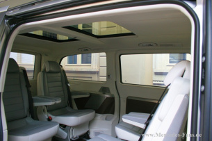 Ein weiteres, besonderes Feature des Viano Vision Pearl ist die Verdunklung der Scheiben im hinteren Bereich des Vianos. Wie bei dem Magic Sky Sonnendach des aktuellen Mercedes-Benz SLK kann man hier auf Knopfdruck dank elektro-chromatischer Fensterglasverdunklung sowohl die Panorama-Scheiben im Dach als auch die Seitenscheiben ab B-Säule und die Scheibe der Heckklappe in ein von außen undurchsichtiges Blau tönen.