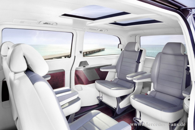 Das Yacht-Feeling selbst wurde aber am besten beim Innenraumdesign umgesetzt. Die großen Panoramadachfenster lassen wie die Skyroofs auf Yachten - mehr Licht in den Innenraum, der komplett, sogar inklusive des vorderen Fußraums in weißem und hellgrauem Naturleder ausgeführt wurde. Das offenporige Leder wurde mit Lochpfeifennähten, die ebenfalls im Schiffsbau verwendet werden, verarbeitet. Dekorelemente aus Aluminium, wie die gebürsteten Zierleisten in den Seitenwänden und die Alu-Dekorleisten im Cockpit, geben dem Innenraum einen modernen Charakter, der sich auch in dem Boden des Vans widerspiegelt. Dieser ist im Fond komplett mit Eichenholzfurnier ausgelegt, auch die Einstiegstufen wurden so ausgeführt.