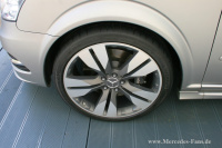 Schon von außen fällt der Viano Vision Pearl mit seinem grauen Mattlack auf, der speziell für den Mercedes-Van angefertigt wurde und an den Anstrich moderner Schnellboote erinnern soll. Neben dem Matt fällt der Lack durch den sogenannten Flop-Effekt auf, dessen Farbe changiert und dem Viano Vision Pearl noch mehr Kontur geben soll. Ebenfalls auffällig sind die 19-Zoll-Felgen, die durch ihre zweifarbige Lackierung einen 3D-Effekt erzeugen.