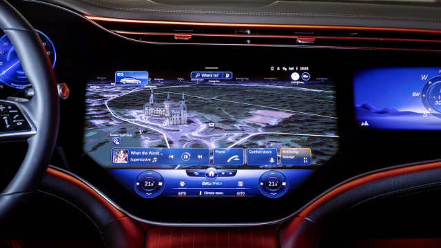 Auch der Reisekomfort ist ein anderer als man es von der Mercedes S-Klasse kennt. Die federt durch ihre Luftfederung weich und mit grenzenlosem Komfort über alle nur erdenklichen Bodenunebenheiten hinweg. Fahrer und Passagiere in der ersten wie zweiten Reihe des elektrischen Mercedes EQS bemerken, dass es bei der Fahrt entkoppelter, aber irgendwie etwas strammer als bekannt zugeht, was allemal Fahrspaß bereitet. Dabei ist die Ruhe während der Fahrt mehr als beeindruckend. Man wirkt von der Außenwelt entkoppelt wozu nicht nur das spektakulär geringe Geräuschniveau, sondern auch der gigantische Bildschirm namens Hyperscreen beiträgt, der beim elektrischen Topmodell der Schwaben das Armaturenbrett in Gänze ersetzt. Drei Displays für Fahrer, Beifahrer und als Zentraleinheit bespielen die Umgebung auf beeindruckende Weise. Dabei ist das scharfe Display für den Copiloten zwar gut und schön; seine Funktionen jedoch kaum mehr aus auf dem zentralen Hochkantdisplay. Aktuell lassen sich hier währen der Fahrt für den Beifahrer keine Filme schauen oder im Netz surfen. Einen echten Mehrwert gibt es somit nur auf den beiden weiteren Bildschirmen im Fond.