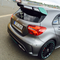 Nun mit dem Understatement ist freilich Finito wenn man vor dem Auto steht. Die ohnehin schon recht dynamische Mercedes A-Klasse wurde im Detail nicht nur gemopft, sondern tatsächlich etwas nachgeschärft. So ist der Diamantgrill jetzt serienmäßig für alle Modelle - bis auf den AMG A 45. Der Frontbereich ist deutlich aggressiver als vorher, die 19“-Felgen mit den 235/35 ZR 19- Conti SportContakt füllen die Radhäuser recht üppig aus. Der Blick auf den Heckdeckel verrät: Wir haben uns zwecks Probefahrt für den A 250 Sport entschieden. Lieferbar ist das Sondermodell „Motorsport Edition“ aber auch für den A 200 d, A 200 d 4MATIC, A 220 d und den A 200. Der AMG-Heckspoiler ist allerdings exklusiv dem A 250 Sportmodellen vorbehalten. Und dieses umgangssprachlich auch schon mal „Pommestheke“ genannte aerodynamische Hilfsmittel ist dann wie das Felgenhorn der schwarzen 19“-Felgen, die Zierspange in der Frontschürze sowie den übrigen Zierelementen in Außenspiegeln und der Heckschürze im charakteristischen Petrolgrün lackiert. Zwar sind auch die Farben Zirrusweiß (650), Nachtschwarz (696), Kosmosschwarzmetallic (191) möglich, aber wer sich für Polarsilber metallic (761), Mountaingrau metallic (787) oder das matte design Mountaingrau magno (662) entscheidet, kommt dem Farbschema der Silberpfeile damit natürlich deutlich näher.