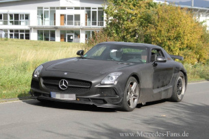 Volle Kraft voraus: Bei der Entwicklung neuer Modelle geht Mercedes-Benz mit Macht in die Offensive. Neben einigen anderen Modellen befindet sich derzeit der Mercedes SLS AMG als Black Series Version in der Erprobung. Der Mercedes-Fans.de Erlkönigjäger hat von seiner Prototypen-Jagd frische Bilder eines Über-SLS mit weniger Tarnung denn je mitgebracht.