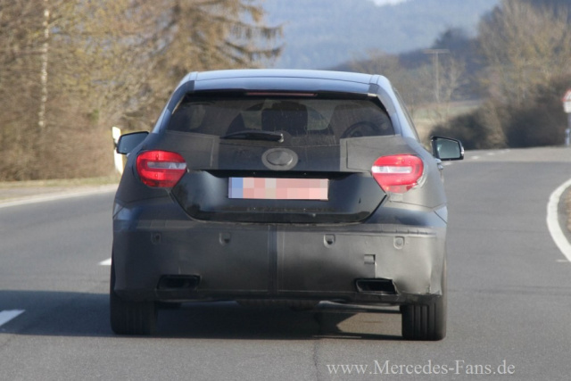 Erstmals ist die serienreife Auspuffanlageder A-Klasse AMG zu sehen. Wie es schient, könnten die beiden trapezförmigen Endrohre in den Heckschürze eingebettet sein.