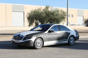 Die neue Tarnstufe zeigt etwas mehr von der Linienführung der neuen Mercedes S-Klasse (W222). So ist zum Beispiel die von den Scheinwerfern nach hinten abfallende Seitenlinie erstmals zuerkennbar.