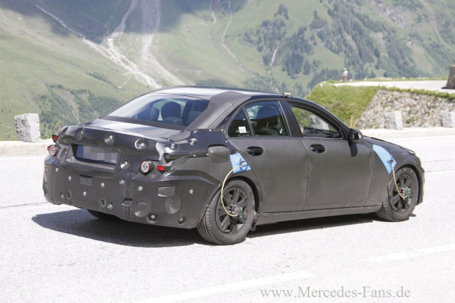 Der Prototyp der kommenden C-Klasse ist noch sehr stark getarnt. Beim Radstand scheint die C-Klasse ein paar Zintimeter zuzulegen.