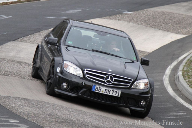 Der Mercedes C63 AMG Black Series Prototyp kommt mit mächtig verbreiterten Radkästen in Sichtweite.