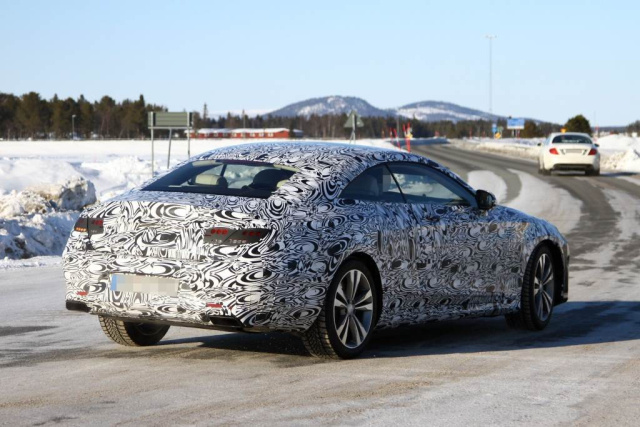 Der Prototyp des Nachfolgemodells der CL-Klasse fuhr in einem neuen Tarnkleid (schwarz-weiße, gemusterte Folie) herum.