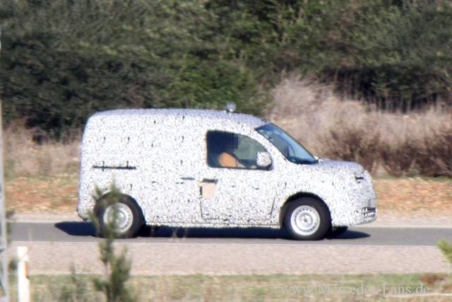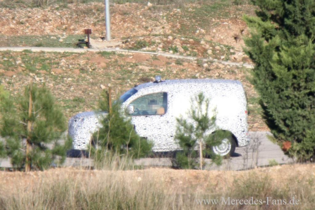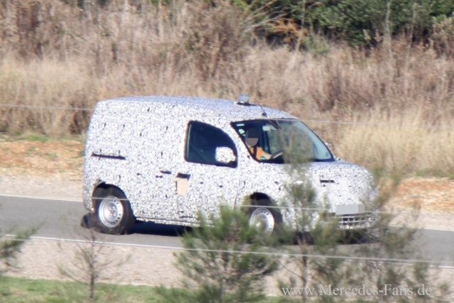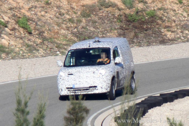 Der stark getarnte Wagen sieht sehr nach Renault Kangoo aus. Das Tarnkleid indes ist typisch für die Maskerade der Mercedes-Benz Nutzfahrzeuge.
