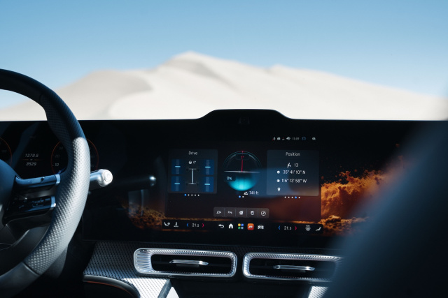So geht es mit Entwicklungsingenieur Michael Heisig auf dem Beifahrersitz zur nächsten Testrunde im neuen GLC EQ. „Wir haben den Luftdruck der Reifen auf 1,1 bar gesenkt“, erläutert Heisig entspannt, „sonst ist dieser GLC im Serientrimm.“ Heißt der weiße Mercedes GLC EQ 400 bietet nicht nur Allradantrieb, sondern auch Luftfederung und Hinterachslenkung. Starterknopf gedrückt und ab geht die wilde Fahrt. Auf dem Zentralbildschirm das Terrain-Programm angesteuert und der Elektro-Schwabe erledigt den Rest. Vorteil Elektroantrieb: ohne zeitliche Verzögerung liegen das maximale Drehmoment von gigantischen 800 Nm und die stattlichen 360 kW / 489 PS Leistung an, mit denen der rund 2,5 Tonnen schwere Koloss die erste Düne erklimmt. Der Schub ist gewaltig, die Räder lenken leicht und problemlos durch den weichen Sand der Dumont Dunes. Das hohe Gewicht des Elektromodells macht sich nur beim Anfahren und den schnellen Bergabpassagen bemerkbar. Immerhin sorgt das 94 kWh schwere Batteriepaket zwischen den Achsen für einen niedrigen Schwerpunkt und so verursacht selbst die starke Neigung der 4,85 Meter langen Karosse beim Fahrer für keine nassen Hände.