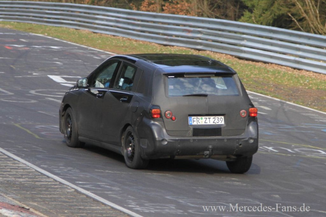 Wie man sieht ist die nächste Generation der B-Klasse in ein neues Entwicklungsstadium eingetreten. Die evolutionären Fortschritte sind trotz Fahrt im Tarnkappenmodus unübersehbar. Die Konturen der hinteren seitenscheibe zeichnen sich ab!