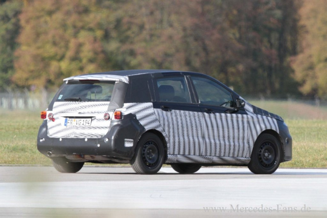 Ohne die bis dato übliche dick aufgesetzte Plastiktarnung erkennt man etwas schärfer die Konturen der kommenden Generation des Mercedes Kompaktvans.