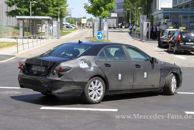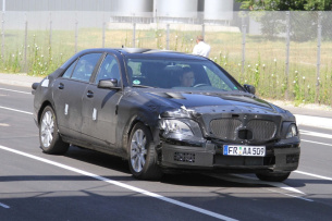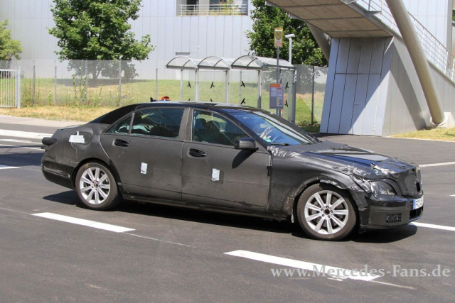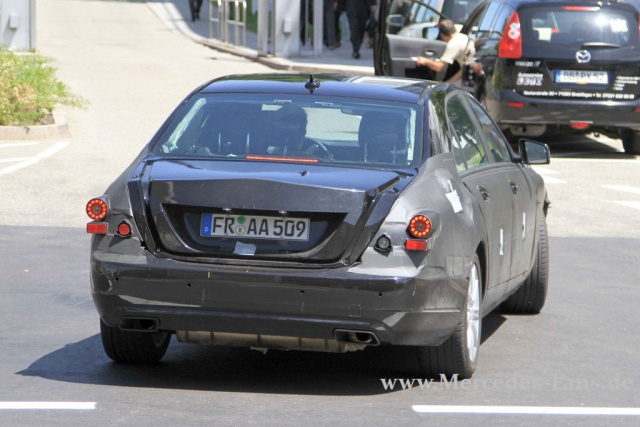 Halb Versuchsträger - halb Erlkönig? Die C-Säule lässt vermuten, dass unter der schweren Tarnung bereits die Karosserie der neuen S-Klasse steckt.