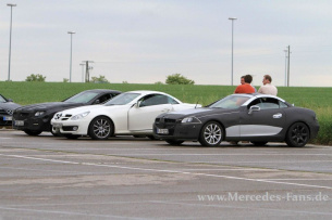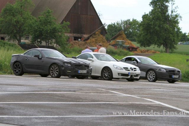 Ein Bild wie aus dem Familienalbum. An abgelegener Stelle formierten sich der aktuelle Mercedes SLK sowie zwei Generationen SLK-Erlkönige. Die Mercedes Tester wähnten sich sicherlich unbeobachtet, aber unser Mercedes Erlkönig-Jäger war schon da! KLICK- erwischt!