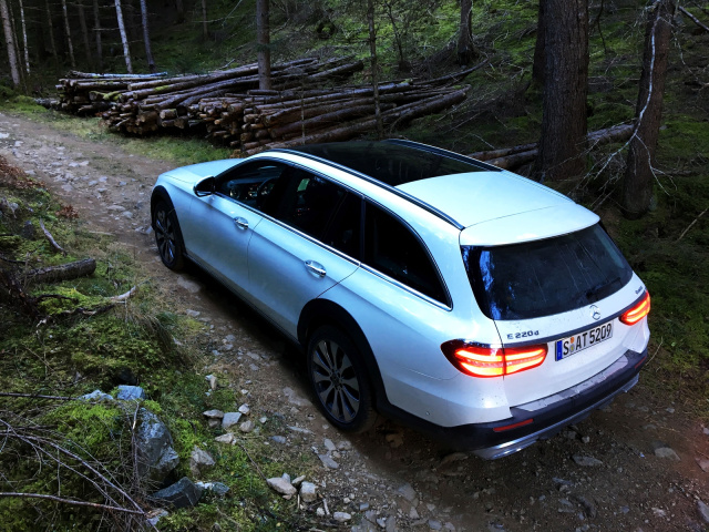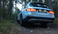 Auf Feldwegen mit Schlaglöchern, hohen Wurzeln und Baumstämmen fühlt sich die E-Klasse All-Terrain überraschend pudelwohl! Wo eine gewöhnliche E-Klasse passen müsste, hebt der All-Terrain die Bodenfreiheit an und kommt ganz entspannt über Stock und Stein. Sehr beeindruckend!