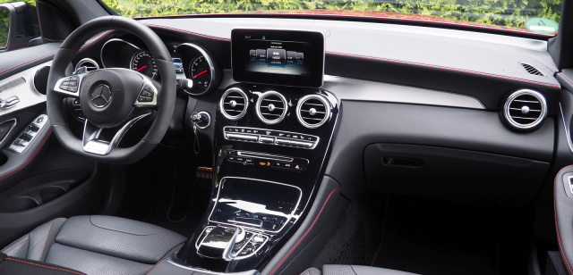 Wie von anderen Modellen bekannt, verfügt auch der GLC 43 über DYNAMIC SELECT. Hier hat der Fahrer die Möglichkeit, aus fünf verschiedenen Fahrmodi zu wählen: Eco, Comfort, Sport, Sport+ und Individuell. Auffällig ist hierbei der wirklich große Unterschied zwischen Comfort und Sport+. Der Comfort-Modus erlaubt ein weiches, sanftes Fahren und sorgt bei den Insassen für ein hohes Maß an Entspannung. Will der Fahrer es mal zügiger angehen lassen, ist der Fahrmodus Sport+ die richtige Wahl. Das AMG-Sportfahrwerk auf Basis des AIR BODY CONTROL erweist sich bei Kurvenfahrten schön straff und direkt abgestimmt. Bei der Kurvenräuberei stellt sich beim GLC-43-Fahrer schnell das gute Sportwagen-Gefühl ein. Zur ausgezeichneten Straßenlage gesellt sich die komfortable Übersicht dank der erhöhten Sitzposition. Die erhabene Haltung bietet Gewähr sowohl für bequemes Reisen als auch für vermehrte Sicherheit, da sie vorausschauendes Fahren ermöglicht.