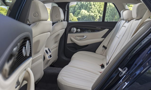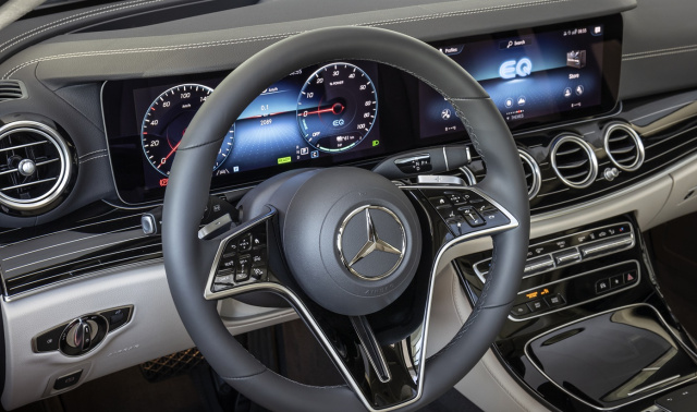 Im Gegensatz zur Limousine wurde bei der Kombiversion in erster Linie die Front überarbeitet; das Heck blieb nahezu unverändert. Im Innenraum gibt es nunmehr obligatorisch und lange überfällig animierte Instrumente und das Bediensystem MBUX. „Serienmäßig bietet die E-Klasse LED-Scheinwerfer sowie unser Bediensystem MB UX mit zwei Bildschirmen“, so E-Klassen-Entwicklungsleiter Michael Kelz, „in der Basisversion mit jeweils 10,25 Zoll und optional dann größer. Zudem ein neues Lenkrad mit berührungsempfindlichen Tasten.“ Umso schwerer verständlich, wieso auf der breiten Mittelkonsole noch immer das Touchpad thront, das die Bedienung der einzelnen Funktionen nicht erleichtert und dann noch Platz kostet. Das alles geht per Sprache oder Touchdisplay deutlich besser. Etwas gewöhnen muss man sich an das neue Lenkrad, über das sich viele Funktionen ebenfalls bedienen lassen. Doch um den rechten Menüpunkt zu treffen muss man mitunter vorsichtig scrollen und drücken. Der ein oder andere haptische Taster hätten das Ganze erleichtert.