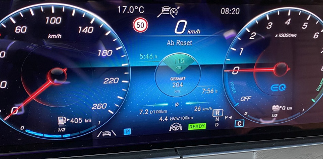 Der Durchschnittsverbrauch des E 300 e soll bei 1,8- 2,1 Litern Benzin liegen und der Stromverbrauch gewichtet bei 14,9 kWh/100 km. Die 1,8- 2,1 Liter Benzin auf 100 Kilometern, schafft ihr natürlich nur, wenn ihr von diesen 100 Kilometern auch 50 Kilometer elektrisch unterwegs seid. Wir haben bei unseren Test einen Durchschnittsverbrauch von etwas über 4 Litern erreicht. Fahren wir die 100 Kilometer nur mithilfe des Verbrenners landen wir bei 7,2 Litern Benzin.