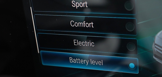 Neben den Fahrprogrammen Individual, Eco, Comfort, Sport und Sport+, bietet die E-Kasse als E 300 e noch die beiden zusätzlichen Fahrprogramme „Electric“ und „Battery Level“. Im Fahrprogramm Battery Level könnt ihr die Ladung der Batterie für einen späteren Zeitpunkt abspeichern. Habt ihr beispielsweise eine volle Batterie, möchtet aber damit aber erst am nächsten Tag elektrisch zur Arbeit fahren, dann könnt ihr im Modus Battery Level den Verbrenner einschalten und somit den Batteriestatus für einen späteren Zeitpunkt abspeichern.
