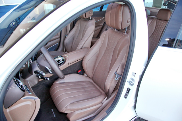 Das Platzangebot vorn ist sehr gut, wobei die breite Mittelkonsole den Knieraum vorn etwas einschränkt. Hinten sitzt man sehr bequem und hat auch bei Fahrern über 1,90 m noch genügend Beinfreiheit. Auch die Kopffreiheit ist trotz des im Testfahrzeug installierten Panorama-Daches, das übrigens komplett neu entwickelt wurde und noch leiser ist, sehr gut. Überhaupt ist die neue E-Klasse ein beeindruckend leises Fahrzeug. Kaum ein Geräusch dringt bis zu den Insassen vor. Der Kofferraum ist praktisch geschnitten, allerdings sehr tief. Die tollen Komfort-Sessel des Aktiv-Multikontursitz-Paketes inkl. Memory-Funktion sehen nicht nur gut aus, sondern bieten auch überragenden Sitz-Komfort. Dazu gibt es eine Sitzbelüftung sowie eine vielstufige, beheizte Massagefuntion, die überraschend kräftig ausfällt. Da möchte man gar nicht mehr aussteigen!