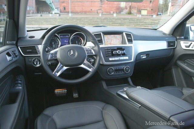 Gegenüber dem Vorgänger ist die M-Klasse 1,6 Zentimeter in der Länge (4,80 Meter), in der Höhe um ca. 2 Zentimeter (1,80 Meter) und in der Breite um 1,5 Zentimeter auf 1,93 Meter gewachsen. Das kommt auch dem Interieur zu Gute. Das Raumangebot ist auf allen Plätze ordentlich, dazu sind die elektrisch verstellbaren mit schwarzem Nappa-Leder bezogenen Sitze vorne angenehm bequem und bieten akzeptablen Seitenhalt.