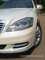 Die optischen Erneuerungen sind schnell aufgezählt: der Chromgrill ist stärker gepfeilt, die Stossfänger neu modelliert und mit einer Chromleiste versehen und die neu gestalteten Scheinwerfer sind serienmäßig mit Bi-Xenon Scheinwerfern ausgestattet. Ebenfalls neu ist das sogenannte LED-Licht-Paket, das wie der Name schon erahnen lässt, die neue S-Klasse mit dem beliebten LED-Tagfahrlicht bestückt.