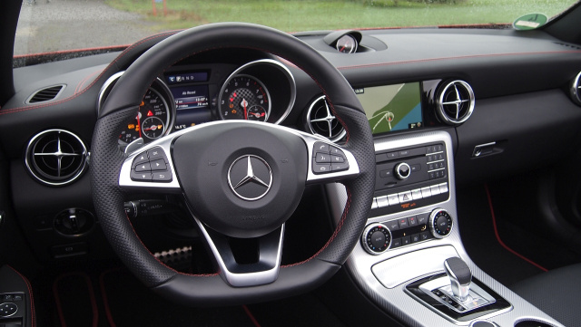 Motorisch ist der SLC 300 gut veranlagt. Der 2,0 Liter große 4 Zylinder-Motor leistet 245 PS bei 5.500 U/min. Der Turbomotor katapultiert den Roadster in 5,8 Sekunden von Tempo 0 auf 100 km/h. Schluss ist erst bei 250 km/h. Die Stuttgarter oder besser gesagt die Bremer (gebaut wird der SLC Seite an Seite mit dem großen Bruder, dem SL, im Werk Bremen ) verpassen dem quicklebendigen 2-Sitzer diverse fahraktive Features. Dazu gehört auch die 9G-TRONIC Automatik und das DYNAMIC SELECT. Wie bereits aus anderen Baureihen und Modellen bekannt, kann der Fahrer je nach Wunsch zwischen Eco, Comfort und Sport (Sport+) bis hin zu Individual seinen „Drivestyle“ selber wählen. Auffällig: Der kleine SLC 300 kann auch durchaus wie ein Großer klingen. Durch die Endrohre schallt ein angenehm sportlicher Klang. Auf kurvigen, bergigen Straßen macht das SLC 300-Fahren am meisten Spaß. Hier ist der Roadster ganz in seinem Element. Das stramme, sportliche Fahrwerk lädt den Fahrer zur Kurvenräuberei förmlich ein. Das hat fast schon fast etwas vom Kart fahren. Nur ist der Komfort im Kart nicht so gegeben wie im Mercedes.