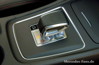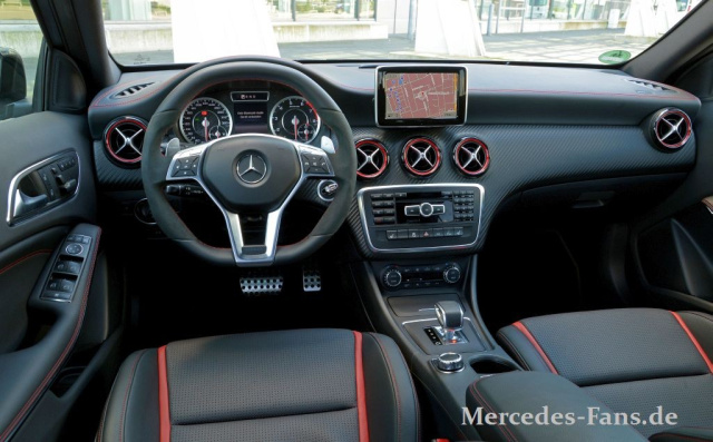 Im Interieur findet sich ein echtes AMG-Highlight. Aus der Mittelkonsole ragt der Schaltknauf des SLS AMG. Sehr cooles Detail. Natürlich ist das Cockpit deutlich am A 250 Sport angelehnt, aber AMG-Armaturen, Sportsitze und ein AMG-eigenes Lenkrad sorgen für die nötige Differenzierung.