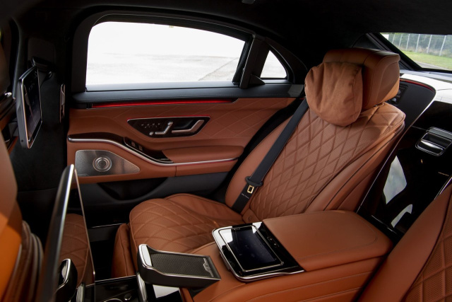 Im Innenraum geht es luxuriös zu. Deswegen gibt es den Mercedes S 680 Guard nur mit langem Radstand und auf Wunsch mit einem Kühlschrank in der Mittelarmlehne des Fonds. Hinter der Sitzbank befindet sich eine Panzer-Schutzwand, an der die Feuerlöschanlage (funktioniert nur bis zu einer Geschwindigkeit bist 10 km/h, da sonst das Mittel verpuffen würde) und der Frischluftzylinder angebracht sind. Der ist bei Gasangriffen besonders wichtig. Denn dann wird die Fahrgastzelle hermetisch abgeriegelt, ein Überdruck erzeugt, der die giftigen Stoffe nach außen drückt und den Innenraum mit frischer Luft flutet.