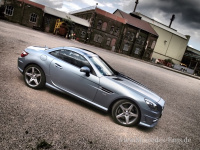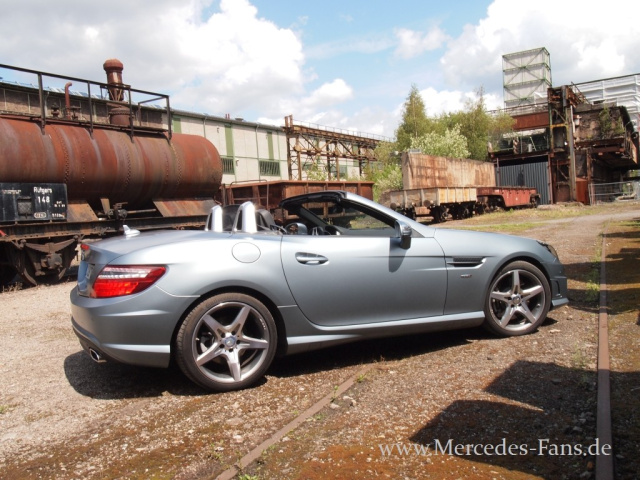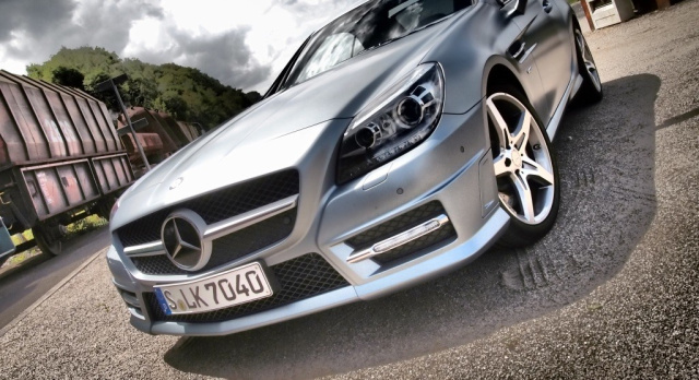 Wir hatten den neuen SLK mit dem Edition1-Paket zur Verfügung, welches nicht nur der Wagenoptik das eine oder andere Sahnehäubchen verpasste. Was den Testwagen aber zweifelsohne bei Passanten in den Focus rückte war seine designo-Lackierung in Magno Gletschergrau matt! Äußerungen wie fantastisch, sehr schick, die passt bis hin zu Fragen wie was kostet die, ist das Folie oder kann man damit in die Waschanlage? unterstrichen die Wirkung der ausgefallenen Farbgebung.