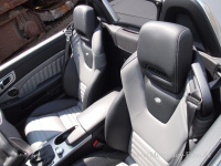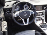 Steht der SLK mit geöffnetem Dach da, kommen seinen inneren Reize besonders gut zur Geltung: Das mit hochwertigen Materialien ausstaffierte Interieur wirkt sehr edel und Elemente aus gebürstetem Aluminium sowie Sportpedale aus Edelstahl mit Gumminoppen liefern einen kontrastreichen Anblick. Das unten abgeflachte, griffige Lederlenkrad fordert förmlich zum Anfassen auf und die bei unserem SLK in Schwarz-Silber gekleideten, komplett elektrisch verstellbaren Leder-Sportsitze bieten guten Seiten- und Rückenhalt.