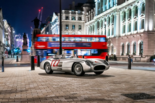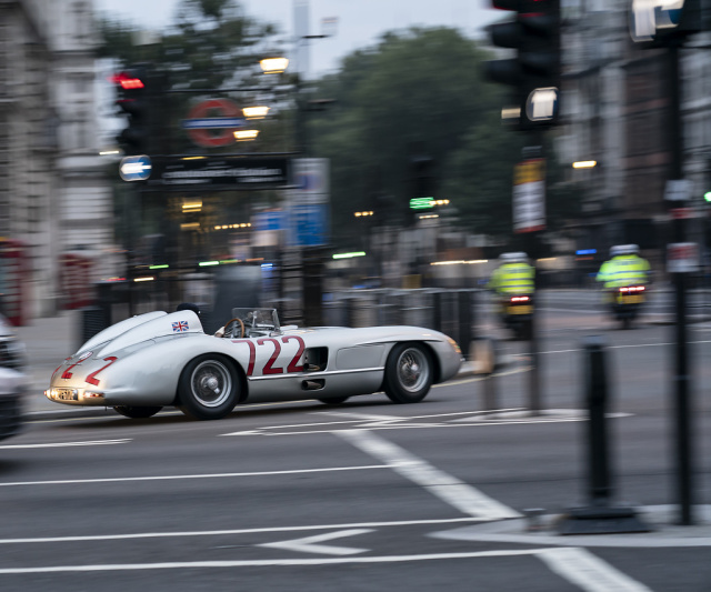 Stirling Moss erzielte in dem Mercedes 00 SLR zusammen mit Denis Jenkinson im Mai 1955 nach dem Start um 7:22 Uhr einen legendären Motorsportsieg der Marke beim italienischen Straßenrennen Mille Miglia von Brescia nach Rom und zurück. Zu Ehren von Stirling Moss ließ das Unternehmen den Reihenachtzylindermotor nun ein letztes Mal bei der Fahrt durch London aufheulen, bevor das Fahrzeug wieder zurück auf seinen festen Platz im Mercedes-Benz Museum in Stuttgart kommt.