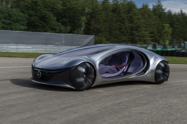 Ähnlich sieht es mit dem Vortrieb aus. Gaspedal, Bremse oder Lenkung sind auch hier weiter denn je in einer fernen Galaxie verschwunden. Gesteuert wird mit einem knubbeligen Handflächenschmeichler, der sich auf Knopfdruck aus der Mittelkonsole herausfährt. Den Joystick mit der ganzen Handfläche leicht nach vorne drücken und schon setzt sich das zwei Tonnen schwere Ufo nahezu lautlos in Bewegung. Zum Bremsen zieht man den Knubbel wieder zurück zur Mitte oder gar nach hinten, wenn es rückwärts gehen soll. Der AVTR zuckelt mit seinem Elektroantrieb flott los und macht dabei überraschend schnell Meter auf dem Testparcours. Angetrieben wird der Mercedes Vision AVTR dabei von vier radnahen Elektromotoren, die zusammen 350 Kilowatt an Leistung bringen. Jedes Rad kann entsprechend der Fahrsituation separat angetrieben werden, wodurch sich die Studie um bis zu 30 Grad im Krebsgang seitwärts fortbewegen kann. Mit dem Steuern nach links und rechts heißt es jedoch feinfühlig sein, denn allzu schnell ist man in den Krabbenmodus gerutscht ohne es zu wollen.