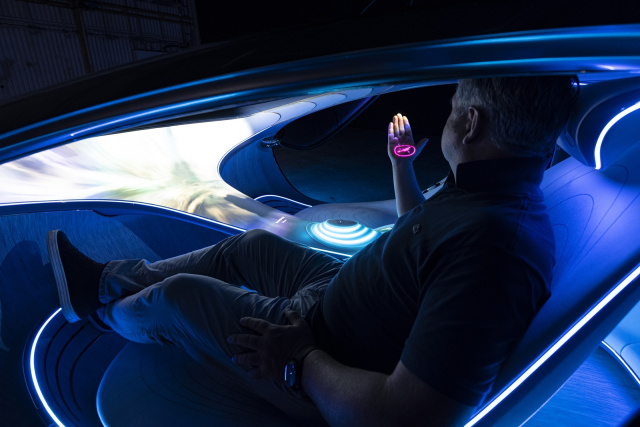 Der helle Fahrersitz ist mehr Liegefläche oder Lümmelsofa denn eine Sitzgelegenheit in einem Fahrzeug. Die Stühle des Zukunfts-Mercedes bestehen aus einem veganen Kunstleder, während der Boden mit dem Rattanholz Karuun ausgelegt wurde, das besonders schnell nachwächst. Überhaupt hat der Mercedes Vision AVTR nicht viel mit einem Auto gemein, sondern mutet eher wie eine fliegende Untertasse an. Kein Lenkrad, kein Cockpit, sondern nur eine mächtige Darstellungsfläche, die sich wie eine Leinwand durch den Innenraum zieht. Touchdisplays oder gar Tasten gehören in dem visionären Zukunftsmodell einer längst vergessenen Historie an. Wer die rechte Hand erhebt, bekommt eine Projektion in die Handfläche, mit der sich die einzelnen Menüpunkte der Bedienung ansteuern lassen.