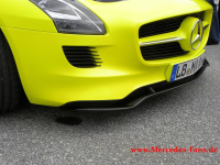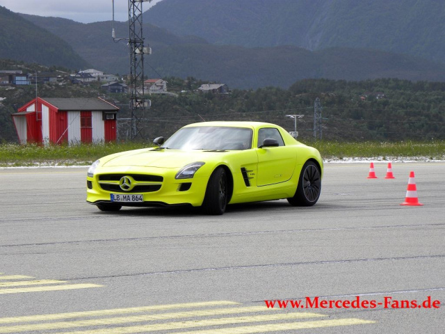Das war ein bemerkenswerter Auftritt. Der schreiend gelbe Elektro-SLS mit der langen Typenbezeichnung Mercedes-Benz SLS AMG E-Cell traf auf einem Parkplatz an der Atlantikstraße in Norwegen auf eine Gruppe Ferraristi. Die sechs, sieben italienischen Supersportwagen auf Europatrip fanden keine Beachtung mehr. Dafür musste sich der E-SLS komplett entblößen: Flügeltüren hoch, Motorklappe ebenfalls, Spoiler hoch, Spolierlippe vor runter nur der Kofferraum blieb zu. Die Ferraristi konnten sich nicht sattsehen; viele Kameras kamen zum Einsatz.