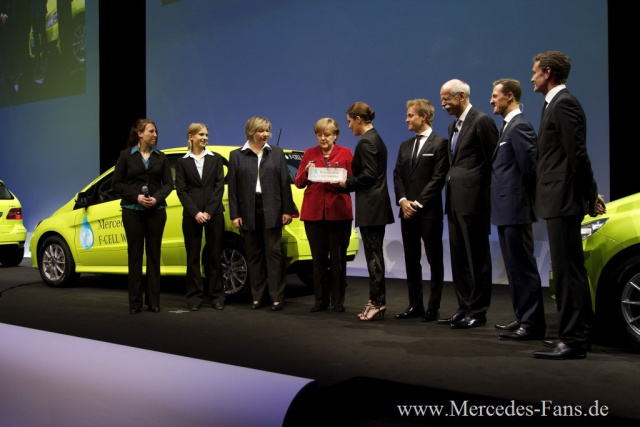 Ein konkreter Beleg für die Innovationskraft von Daimler und Mercedes-Benz im Bereich grüner Technologien wurde im Rahmen des Festakts auf eine Weltreise geschickt. Gemeinsam mit der Bundeskanzlerin, den Motorsportlern Michael Schumacher, Nico Rosberg und David Coulthard sowie drei Ingenieurinnen der Daimler AG startete Dr. Zetsche symbolisch den Mercedes-Benz F-CELL World Drive. In125 Tagen fahren drei Modelle der B-Klasse mit Brennstoffzellenantrieb rund um den Globus.