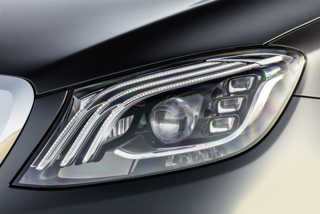 Moderner Luxus manifestiert sich in der neuen S-Klasse durch höchste Qualität der Materialien und ebensolche Verarbeitung. Status und technologische Kompetenz sind jetzt noch erlebbarer. Alle Modelle erhalten eine neue Kühlerverkleidung: Die Versionen mit Sechs- und Achtzylinder-motoren bekommen drei Doppellamellen sowie senkrechte Stäbe im Kühlergrill in Schwarz hochglänzend. Die Limousine mit langem Radstand und V12-Motor erhält zusätzlich senkrechte Stäbe im Kühlergrill in Chrom. Die Ausnahmestellung des Mercedes-Maybach unterstreicht die aufgewertete Frontpartie mit einem hohen Anteil an Chromzierteilen. Neu ist auch der Maybach Schriftzug zwischen den Lamellen des Kühlergrills auf der Fahrerseite.In Kombination mit den neuen MULTIBEAM LED Scheinwerfern (Sonderausstattung, Details weiter unten) besitzt die S-Klasse drei markante Lichtfackeln als exklusives Designelement. Ebenso neu ist der vordere Stoßfänger mit ausgeprägten Lufteinlässen und sportlicher Ausstrahlung.